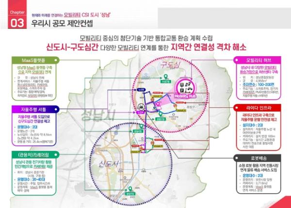 이 사업을 통해 ▲성남형 통합모빌리티(MaaS, Mobility as a Service)플랫폼 ▲지역 맞춤형 모빌리티 허브▲ 관용차량 주민 개방형 공유 서비스 ▲ 전기차 공유 및 퍼스널 모빌리티 서비스 ▲ 전통시장 로봇배송 서비스 ▲자율주행 셔틀서비스 등을 도입하게 된다.