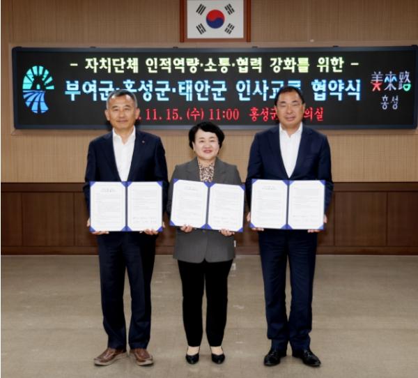 군은 지난 15일 홍성군청 회의실에서 박경찬 부군수를 비롯해 소명수 부여부군수와 조광희 홍성부군수 등 각 지자체 관계자들이 참석한 가운데 ‘태안·홍성·부여 인사교류 협약식’을 갖고 지자체 간 인사교류 활성화를 통한 상생발전에 뜻을 모았다.