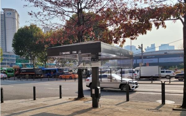 서울 서초구가 신개념 ‘개방형 제연 흡연시설’을 반포쇼핑타운 7동(반포동) 앞 인도에 설치하고 시범운영에 나섰다.