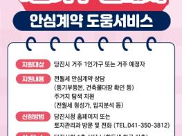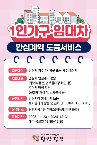 당진시는 오는 23일부터 전?월세 사기 피해 예방을 위해 ‘1인 가구 임대차 안심 계약 도움 서비스’를 실시한다.