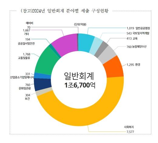 세출에서 재정수요가 가장 큰 분야는 ‘사회복지’ 분야로 일반회계 중 7,577억 원(45.4%)을 차지하고 있으며, ‘교통 및 물류’ 분야가 1,768억 원(10.6%), ‘환경’ 분야 1,295억 원(7.7%), ‘일반 공공행정’ 분야가 1,019억 원(6.1%)으로 뒤를 이었다.