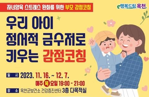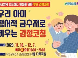 옥천군보건소와 정신건강복지센터는 자녀 양육의 어려움을 겪고 있는 여성 양육자를 대상으로 16일부터 12월 7일까지 매주 목요일에 보건소 건강증진센터에서 자녀 양육 스트레스 완화를 위한 감정코칭 프로그램을 진행한다.
