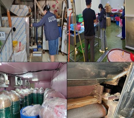 C 업소는 영업장 외의 장소에 냉동창고를 두고 새우젓을 보관했으며, D 업소는 제조가공실 분쇄기 내외부 고춧가루 찌꺼기, 후드 주변 거미줄, 착유기 주변 곰팡이 등 위생 상태가 불량해 적발됐다.