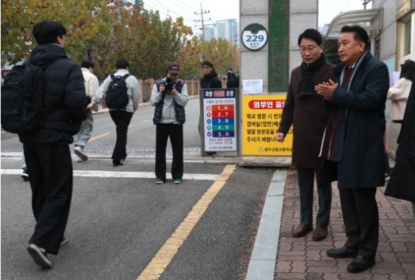 2024학년도 대학수학능력시험이 치러진 16일 김영환 충북지사가 신흥고등학교를 찾아 수험생, 학부모, 응원 나온 재학생 등을 격려했다.