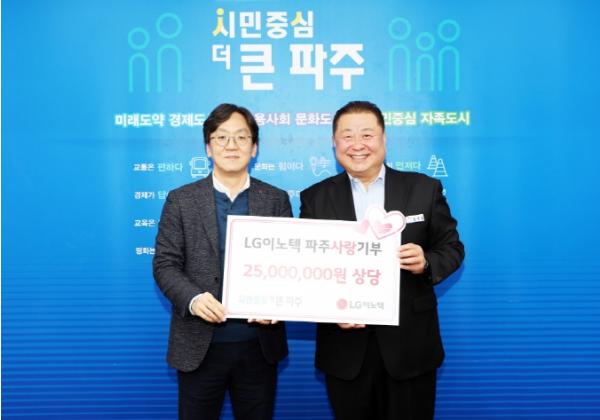 한편, 엘지(LG)이노텍은 지속적인 기부와 후원으로 사회공헌을 실천하고 있으며 2022년부터 2023년까지 파주시 관내에 1억 3천여만 원을 기부하고, 장애인 한마음 체육대회, 취약계층 및 독거노인 나눔 활동에 임직원들이 직접 참여하며 지역 봉사활동에도 노력을 아끼지 않고 있다.