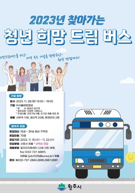 원주시는 오는 22일까지 ‘2023 찾아가는 청년 희망드림버스’ 참여자 70명을 선착순 모집한다.