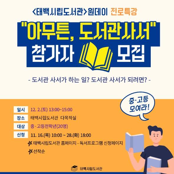 태백시는 오는 12월 2일 태백시립도서관에서 원데이 진로특강 “아무튼, 도서관 사서”를 개최한다고 전했다.