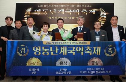 이번 대회에서 영동난계국악축제는 축제경영부문 금상, 친환경프로그램부문 은상, 홈페이지부문 미국 본선 동상, 총 3개 부문을 수상했다.