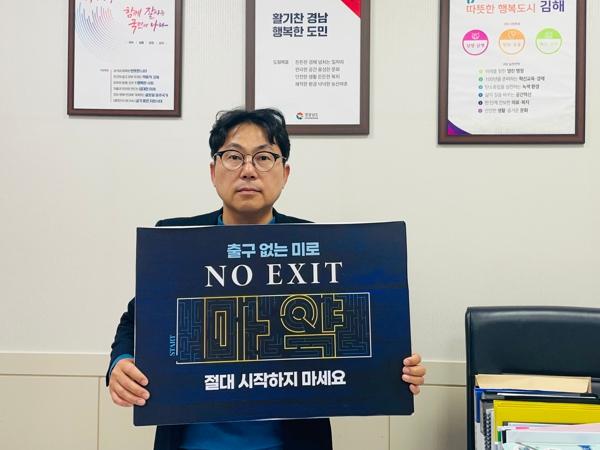 김재용 김해시 장유2동장이 마약 범죄 예방을 위한 ‘NO EXIT’ 캠페인에 참여했다고 17일 밝혔다.
