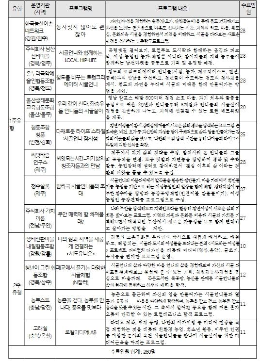 올해로 두 번째 해를 맞이한 시골언니 프로젝트는 총 12개의 프로그램으로 숙박과정(1주과정 및 2주과정)을 통해 교육기간 동안 작은 도서관, 목공반, 지역 라디오 방송 제작 등 꼭 농사를 짓지 않아도 지역에 정착해 다양한 분야에서 활동하고 있는 시골언니들을 만나고, 그들의 농촌라이프 스타일을 경험하면서 향후 정착에 필요한 사회적 관계망을 구축할 수 있는 계기를 마련했다.