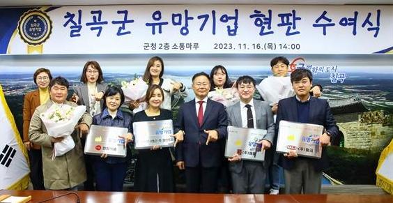 칠곡군은 지난 16일 지역 경제를 견인할 2023년 칠곡군 유망기업 4곳을 선정하고 칠곡군청에서 인증서 및 현판 수여식을 가졌다.