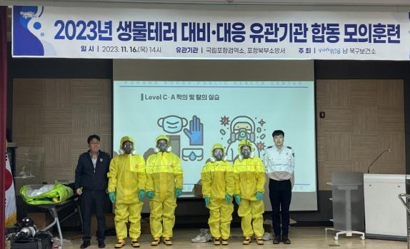포항시 남·북구보건소는 지난 16일 북구 치매안심센터 3층 대강당에서 북부소방서, 국립검역소 등 유관기관과 합동으로 ‘2023년 생물테러 대비·대응 소규모 모의훈련’을 실시했다.