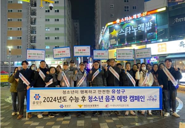 대전 유성구는 2024학년도 대학수학능력시험이 치러진 16일 저녁 수험생들의 음주 등 일탈행위를 예방하고자 봉명동 번화가 일대에서 청소년 음주예방 합동 캠페인을 펼쳤다고 전했다.