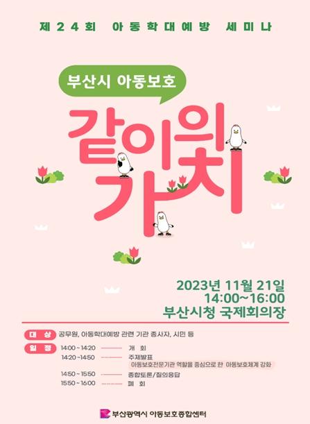 부산시 아동보호종합센터는21일 오후 2시 시청 국제회의장에서 '제24회 아동학대예방 세미나 : 부산시 아동보호, 같이의 가치'를 개최한다고 밝혔다.