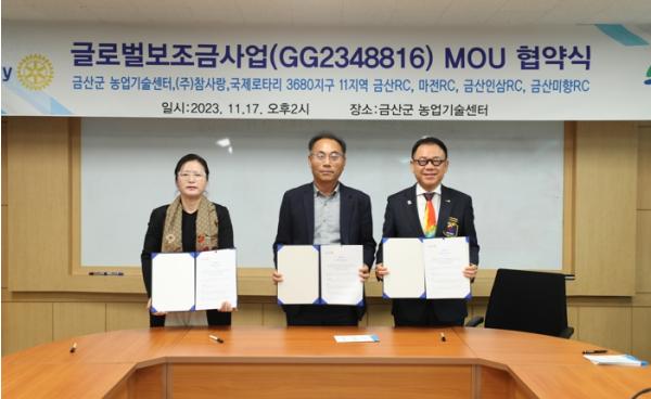 이날 협약을 통해 금산에서 활동하는 금산로타리?마전로타리?금산인삼로타리?금산미향로타리 등 4개 단체가 글로벌 보조금으로 재배시설을 제공하고 ㈜참사랑이 북한이탈주민과 함께 운영하는 북한이탈주민 글로벌그랜트 사업을 추진한다.