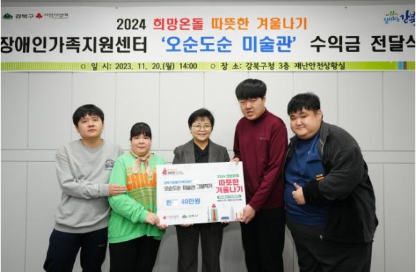 이 수익금은 강북구장애인가족지원센터가 장애인의 날을 맞아 발달장애 그림작가 전시회를 열어 마련한 것으로, 저득층 취약계층을 위한 ‘2024 희망온돌 따뜻한 겨울나기’ 모금사업에 전액 기부했다.