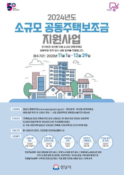 성남시는 오는 12월 29일까지 ‘2024년도 소규모 공동주택 보조금 지원사업’ 신청을 받는다.