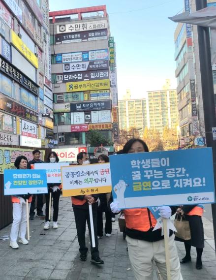 이날 장안구보건소 직원 10명은 길거리 담배꽁초를 주우며 청소년의 간접흡연 위험성을 알렸다. 또 ‘학생들이 꿈꾸는 공간, 금연으로 지켜요’라는 문구가 적힌 손팻말을 들고 홍보하며, 금연 홍보물을 배부했다.