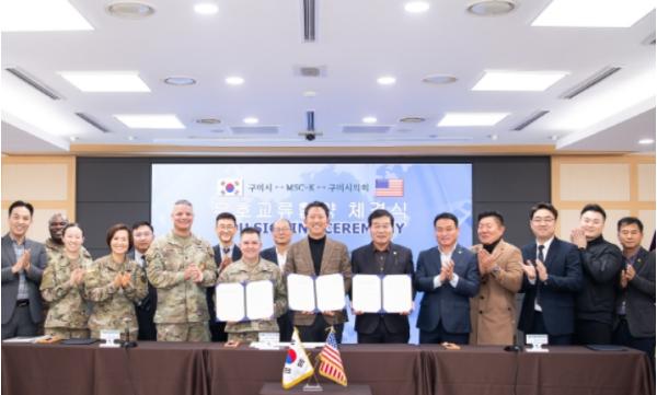 구미시는 20일 시청 대회의실에서 한국 미육군 물자지원 사령부 여단장, 시의회 의장 등 15여 명이 참석한 가운데 우호 교류 협력을 위한 협약을 체결했다.