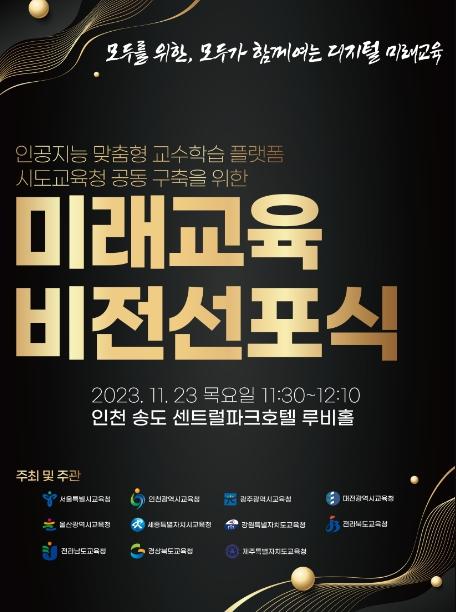 인천광역시교육청은 서울, 광주, 대전, 울산, 세종, 강원, 전북, 전남, 경북, 제주 10개 시도교육청 및 한국지능정보사회진흥원과 인공지능 맞춤형 교수학습 플랫폼 중심의 비전 공유와 협업체계 구축을 위한 미래교육 비전선포식을 송도센트럴파크호텔에서 23일 개최한다.