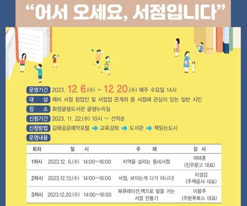 김해시는 내달 6일부터 화정글샘도서관에서 지역서점 활성화 아카데미 “어서오세요, 서점입니다.”를 운영한다고 22일 밝혔다.