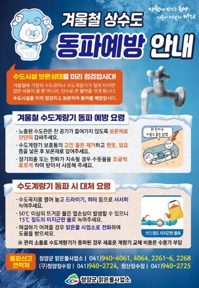 또한, 청양군은 수도시설 동파 예방을 위하여 군의 노력과 함께 군민의 적극적인 참여도 매우 중요함을 강조했다. 동파 예방을 위해서는 ▲수도계량기 보호통 내부 헌 옷 등으로 감싸기 ▲ 장기 외출 시 수돗물 조금 흐르게 하기 ▲옥외화장실, 외부 노출 배관 보온재로 묶기 등 보온 조치를 해야 하고, 수도시설이 얼었을 때는 미지근한 물 또는 헤어드라이어기로 서서히 녹여야 한다.