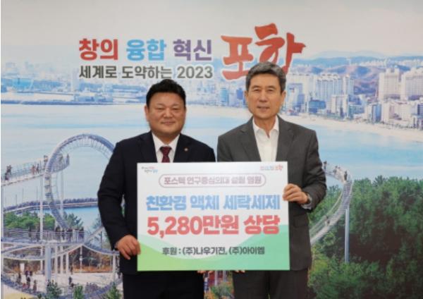 ㈜나우기전과 ㈜아이엠은 22일 포항시청을 찾아 포항시 지역 내 저소득층 및 복지시설을 위해 5,280만 원 상당의 친환경 액체 세제를 전달했다.