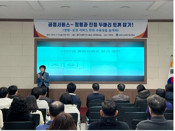 ‘고객만족서비스 및 청렴 교육’은 직원들의 민원서비스 마인드를 재확립하고 민원인 응대 스킬을 제고하며 청렴리더십 향상 및 부패 취약분야를 중점 강조하고자 마련됐다.