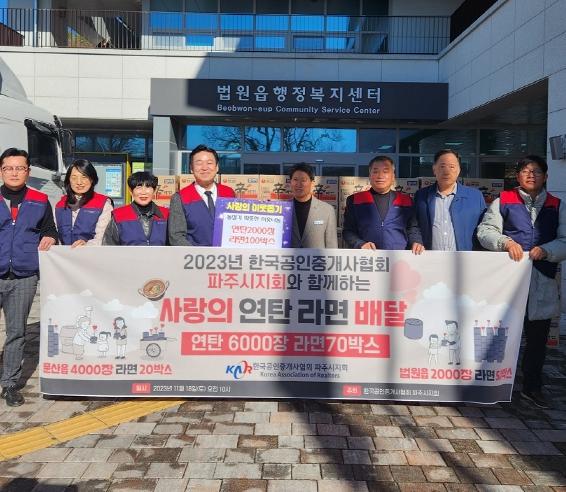파주시 법원읍은 21일 한국공인중개사협회 파주시지회로부터 라면 100박스와 연탄 2,000장을 기부받았다고 밝혔다.