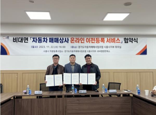 시흥시가 지난 22일 경기도 자동차매매사업조합 시흥시지부 및 ㈜씨엘엠앤에스와 자동차매매상사 온라인 (단순)이전등록시스템 운영을 위한 업무협약을 경기도 자동차매매사업조합 시흥시지부 회의실에서 체결했다.