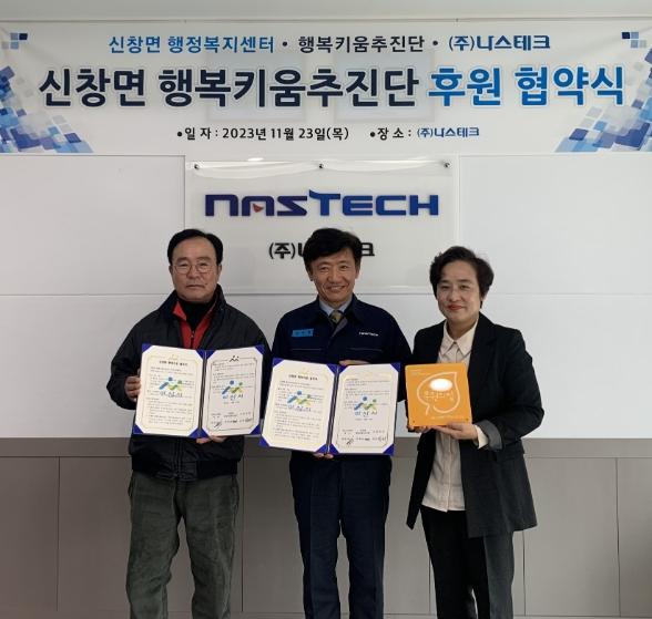 ㈜나스테크가 지난 23일 신창면 행복키움추진단과 저소득 가정을 지원하는 후원 협약을 체결했다.