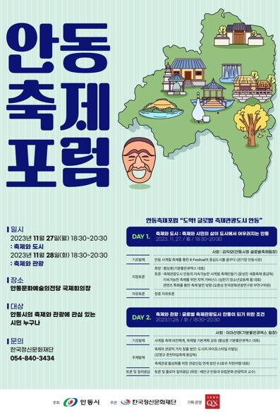 안동축제포럼은 2023년 11월 27일부터 28일까지 이틀간 안동문화예술의전당 국제회의장에서 진행되며, 축제와 관광에 관심 있는 시민 누구나 참여할 수 있다.