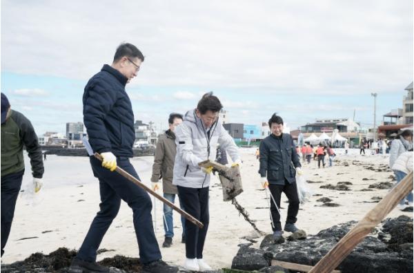 오영훈 지사는 이날 플로깅과 비치코밍, 자연테라피에 참여해 도민 및 관광객들과 함께 해양쓰레기를 줍고 힐링하며 제주바다사랑을 몸소 실천했다.