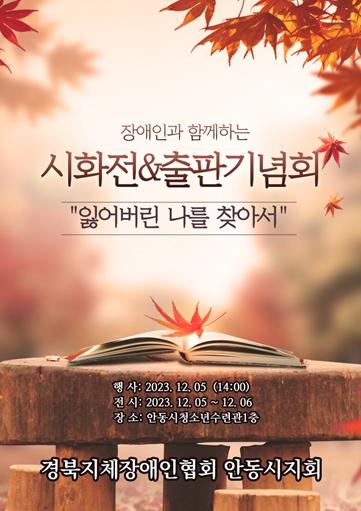 사)경북지체장애인협회 안동시지회는 2023년 12월 05일 안동시 청소년수련관 1층 정서함양관에서 장애인과 함께하는 시화전&출판기념회 ‘잃어버린 나를 찾아서’개최한다.