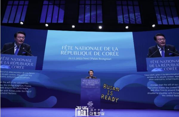 윤석열 대통령 부부는 2030 부산세계박람회 유치 성공을 위한 프랑스 파리 방문 둘째 날 마지막 공식 일정으로 오늘(현지시간 11. 24, 금) 저녁 프랑스 파리의 브롱냐르궁(宮)에서 개최된 국경일 리셉션에 참석했다.