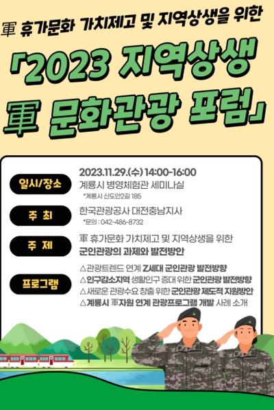 계룡시는 오는 29일 계룡병영체험관에서 한국관광공사 대전충남지사와 함께 ‘2023 지역상생 군문화관광포럼’을 개최한다고 밝혔다.