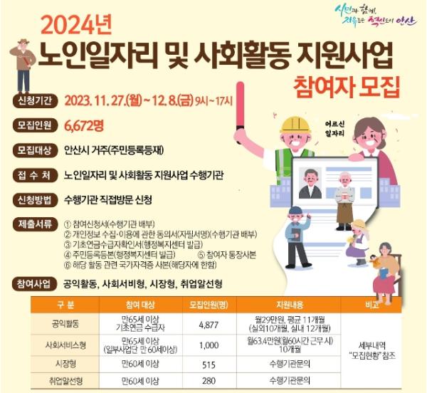 안산시는 ‘2024년 노인일자리 및 사회활동 지원사업’ 참여자 6천672명을 다음달 8일까지 모집한다고 27일 밝혔다.