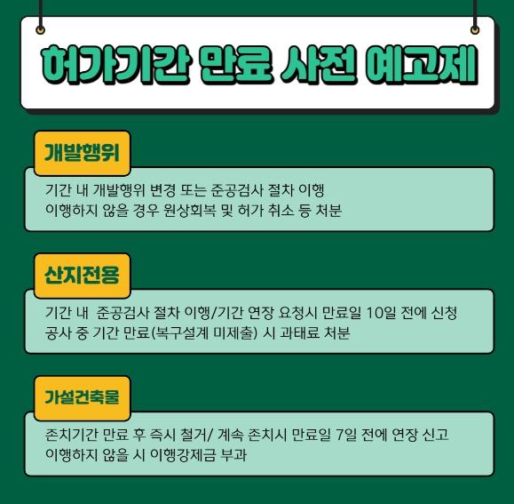 시에 따르면 허가기간 만료 사전예고제는 건축 관련 개발행위 허가기간, 산지전용 허가기간, 가설건축물 존치기간 등이 만료되기 30일 이전에 필요한 행정절차와 만료 사실을 민원인에게 미리 알려주는 제도다.