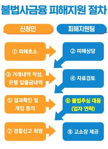 불법사금융 피해상담 서비스는 금감원 피해신고센터처럼 대응 방안 안내나 관계기관 연계에 그치지 않는다. 상담 과정에서 확인된 불법행위를 불법사채업자에게 적시하고 추심 중단, 법정 금리 준수 및 거래 종결을 요구하는 등 피해 상황에 직접 개입하여 신속한 해결을 꾀하는 점에서 차이가 있다.