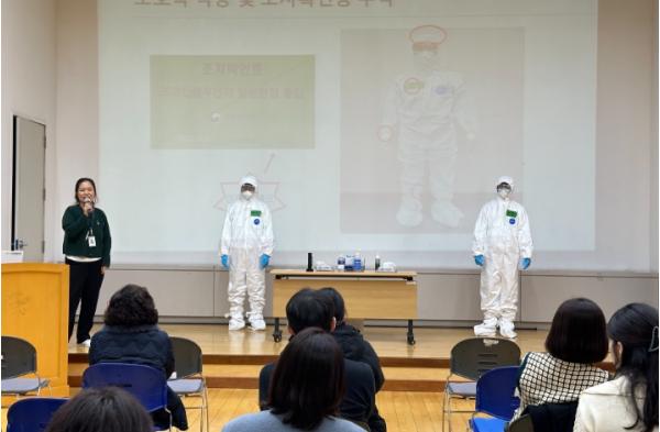 이들은 조류인플루엔자 발생에 대비해 역할을 분장하고, 개인 보호구 착·탈의 방법, 살처분 현장 투입자의 인체 감염 예방을 위한 조치 방법, 현장 대응 요령 등을 실습했다.