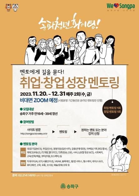 이에 구는 청년들이 직접 정책을 발굴?기획하는 송파청년네트워크가 제안한 ‘송파 취?창업 멘토링 플랫폼’ 사업을 추진, 청년 맞춤형 지원에 나선다.