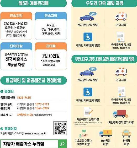 단속 지역은 서울, 인천, 경기, 부산, 대구, 광주, 대전, 울산, 세종이며 12월~3월 4개월 동안 저공해 조치를 하지 않은 5등급 차량이 해당 지역에서 운행하다 적발될 경우 1일 10만원의 과태료가 부과된다.