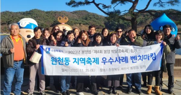 수원시 영통구 원천동은 지난 25일 지역축제 벤치마킹을 위해 주민자치회, 통장협의회, 새마을3단체 등 15여명이 참여한 가운데 자매결연지인 제천시 봉양읍의 초청으로‘제4회 봉양 박달콩축제’현장을 방문해 우수사례 견학을 진행했다.