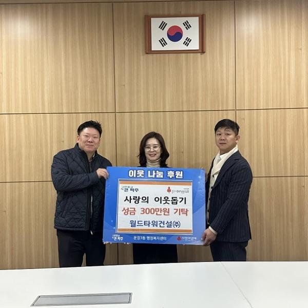 파주시 운정3동은 29일 월드타워건설(주)에서 관내 저소득층을 위해 성금 300만 원을 기탁했다고 밝혔다.