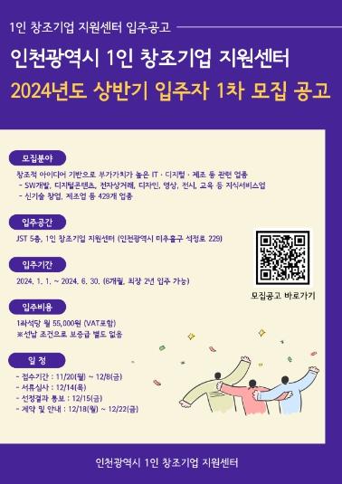 인천테크노파크(인천TP)는 오는 12월 8일까지 ‘인천광역시 1인 창조기업 지원센터’의 2024년도 상반기 신규 입주기업을 모집한다고 1일 밝혔다.