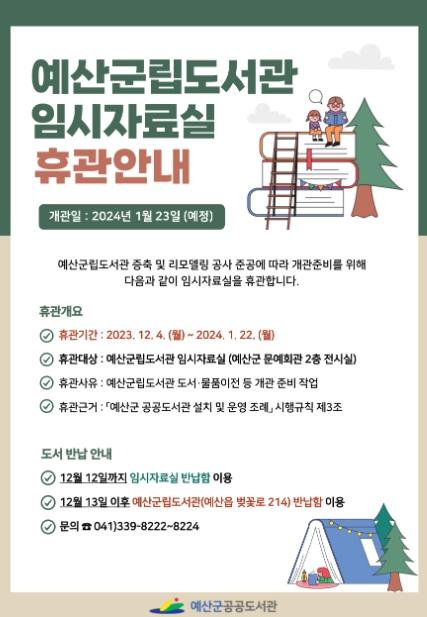 예산군립도서관은 군립도서관 증축 및 리모델링 공사 준공에 따른 재개관 준비를 위해 오는 12월 4일부터 2024년 1월 22일까지 약 7주간 임시자료실을 휴관한다고 밝혔다.