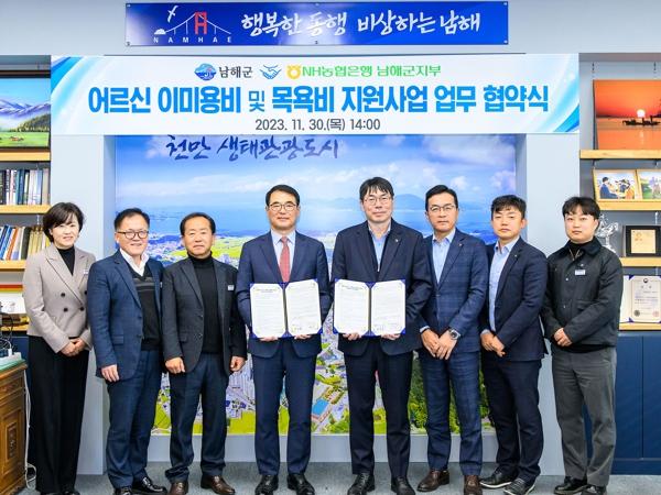 남해군은 30일 NH농협은행 남해군지부와 업무협약을 맺고 ‘어르신 이·미용비 및 목욕비 지원사업’의 첫걸음을 뗐다.