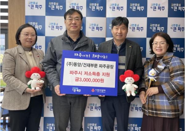 파주시는 30일 ㈜동양/건재부문 파주공장에서 저소득 취약계층을 위한 후원금 300만 원을 기탁 받았다고 밝혔다.