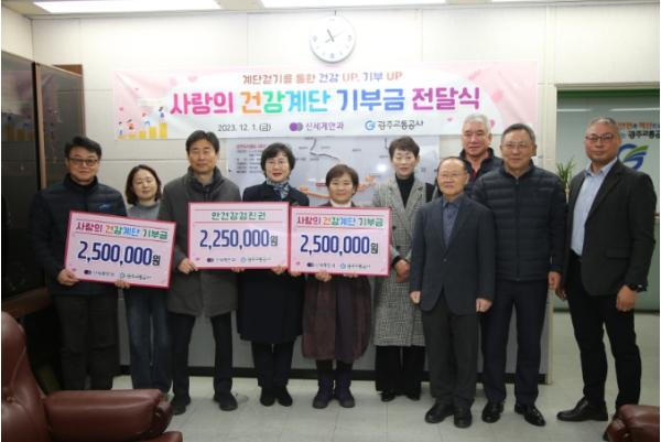광주교통공사와 신세계안과는 1일 광주시 서구 마륵동 본사에서 ‘사랑의 건강계단’ 기부금 전달식을 갖고 후원금 5백만원과 225만원 상당의 안(眼)건강검진권을 마라나타전문요양시설, 광주이주여성지원센터, 광주세광학교에 전달했다.