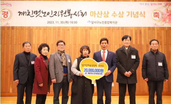 대구 달서구는 11월 30일 달서구노인종합복지관에서 지난 11월 23일 아산상을 수상한 깨친멋노인자원봉사회의 기념 축하연을 개최하며 봉사회에서 상금 2,000만원 전액을 달서인재육성장학재단에 후원하는 전달식도 진행했다.